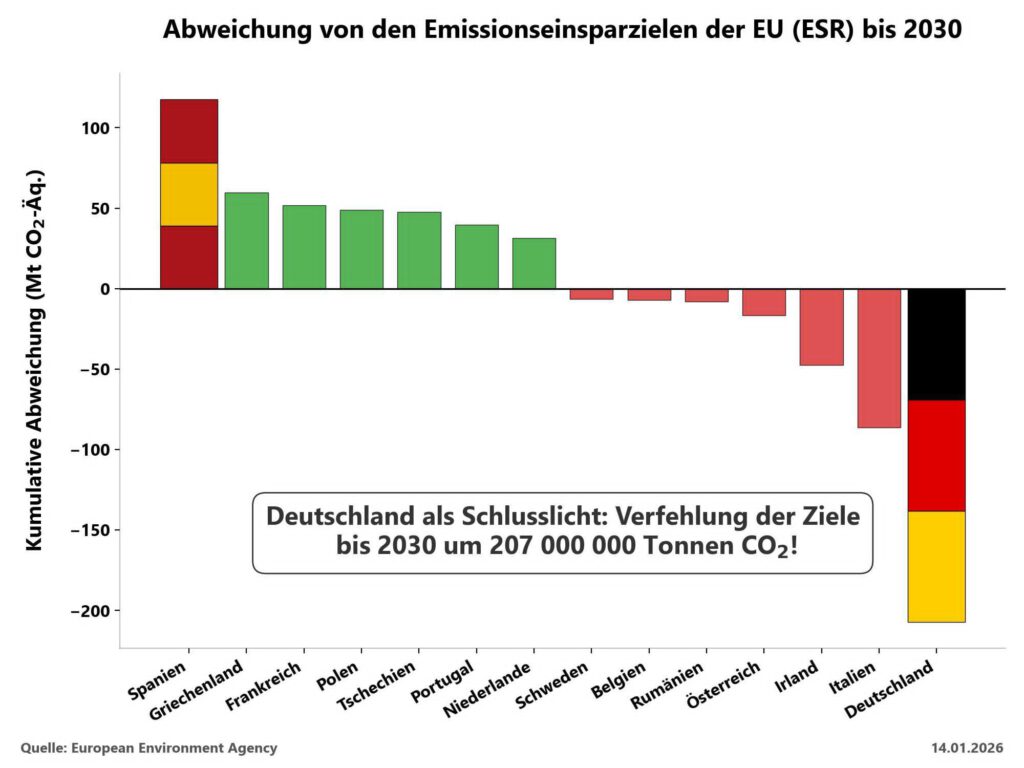 Innerhalb Europas sieht Deutschland sehr schlecht aus. Beim Vergleich mit anderen Ländern in Europa liegen wir, was die Erreichung der festgelegten Klimaziele anbelangt, an letzter Stelle.