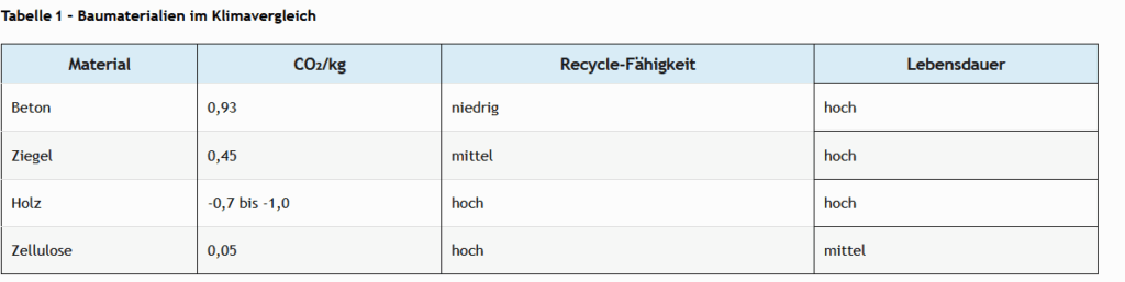 Sinnvoller wäre es Holz als Baustoff zu verwenden, dann bleib der Kohlenstoff über Jahrzehnte gebunden und ersetzt in vielen Bereichen Beton. s. nachfolgende Tabelle